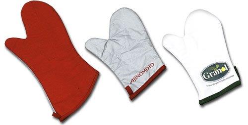 Luvas em brim ou algodão metalizado, forradas, acabamento em viés colorido.