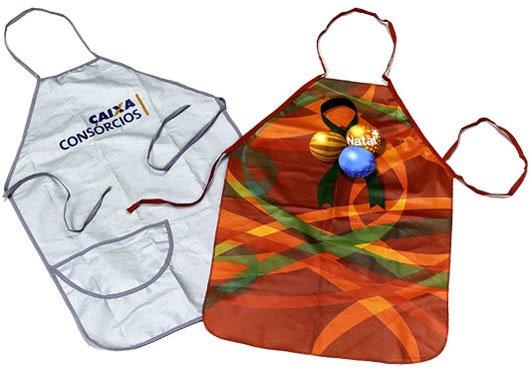 Avental em brim ou algodão metalizado, acabamento em costura ou viés colorido.