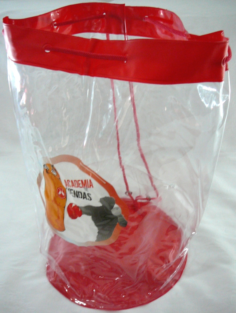 Mochila em pvc transparente , gravado em silk screen, acabamento em solda eletrônica.